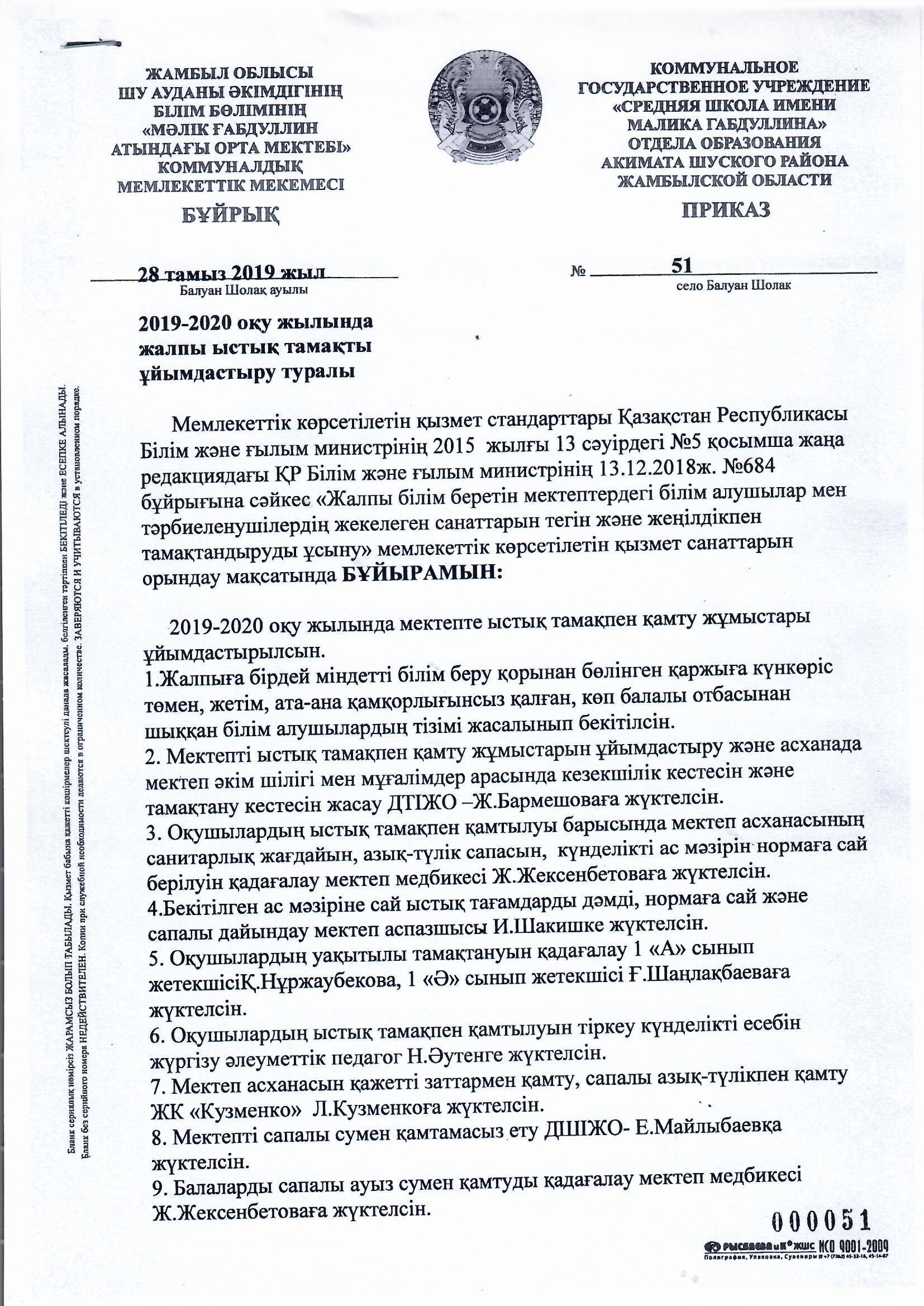 Ыстық тамақ ұйымдастыру бұйрық » М.Ғабдуллин атындағы орта мектеп